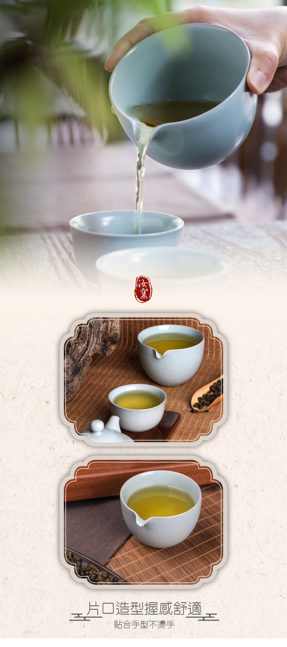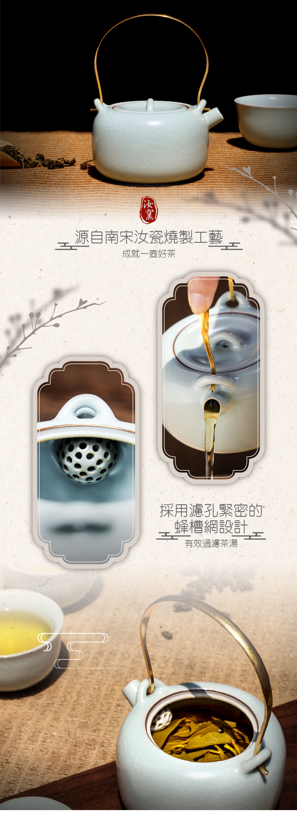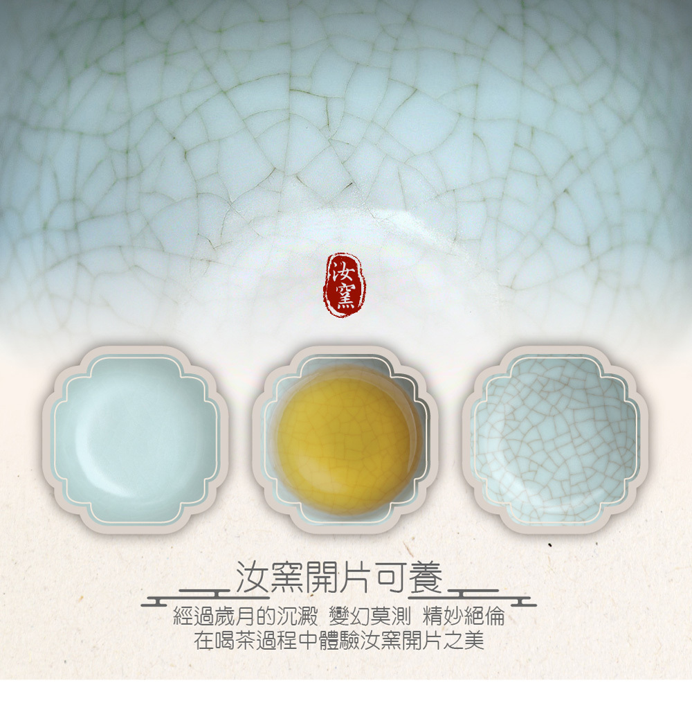 源自南宋千年燒製工藝,釉色如「雨過天青雲破處」般清雅脫俗。在長久的品茗歲月裡,釉面隨時間產生的自然開片紋路,記錄著每一泡茶的熟成之美,讓飲茶成為一種跨越時空的藝術享受。