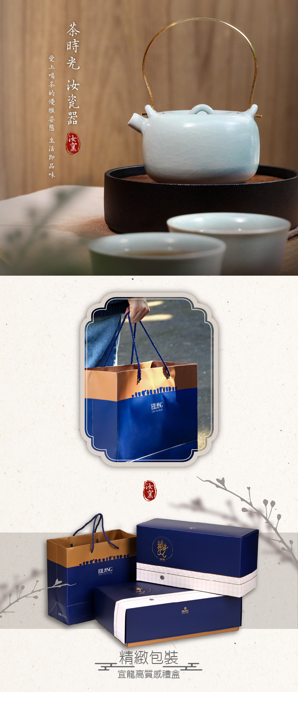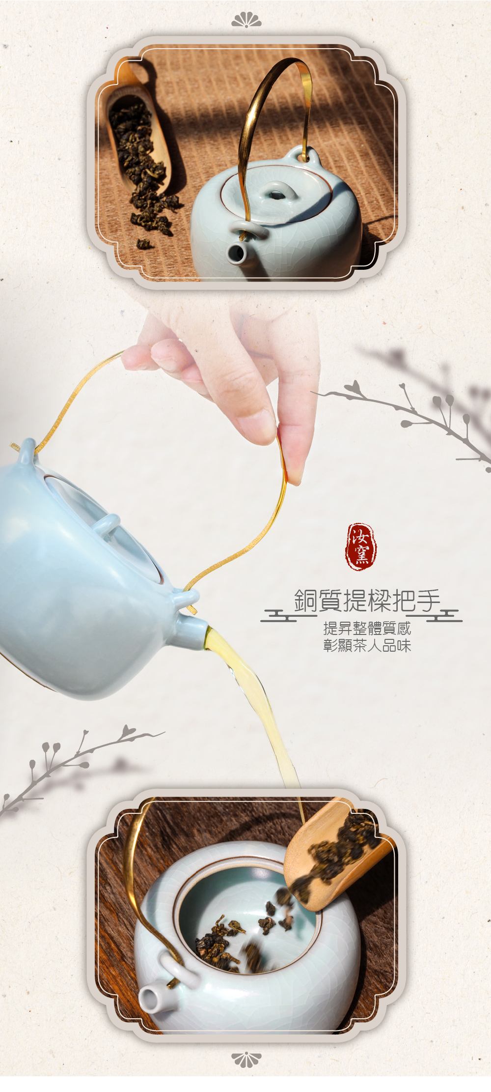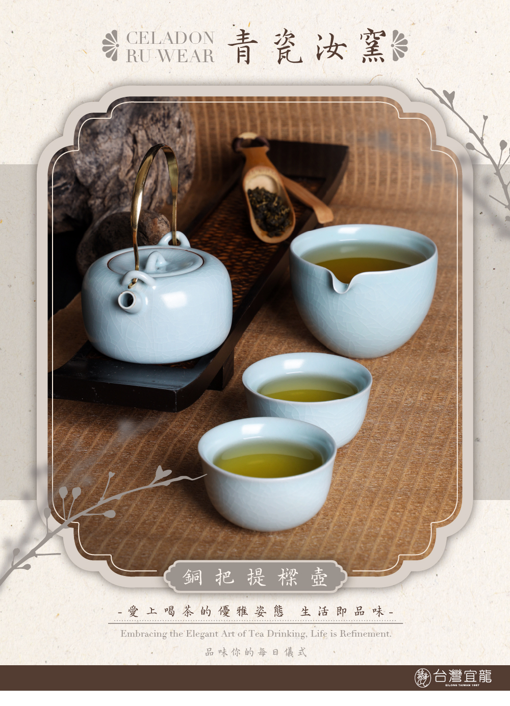源自南宋千年燒製工藝,釉色如「雨過天青雲破處」般清雅脫俗。在長久的品茗歲月裡,釉面隨時間產生的自然開片紋路,記錄著每一泡茶的熟成之美,讓飲茶成為一種跨越時空的藝術享受。