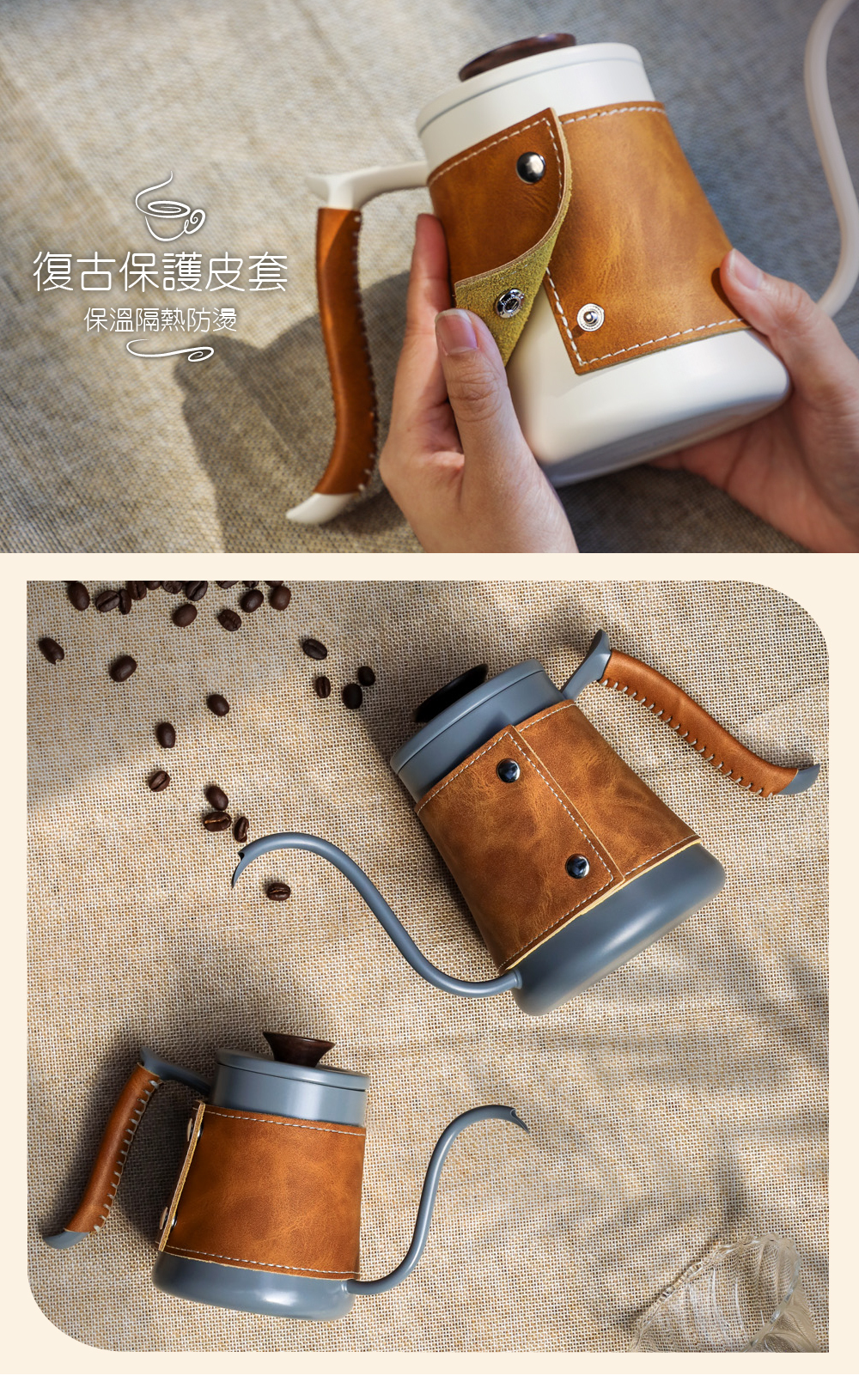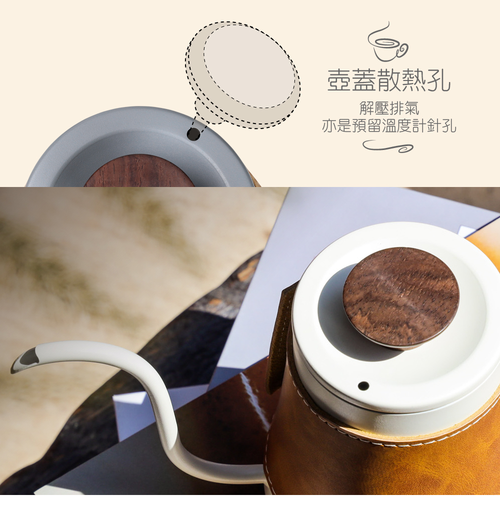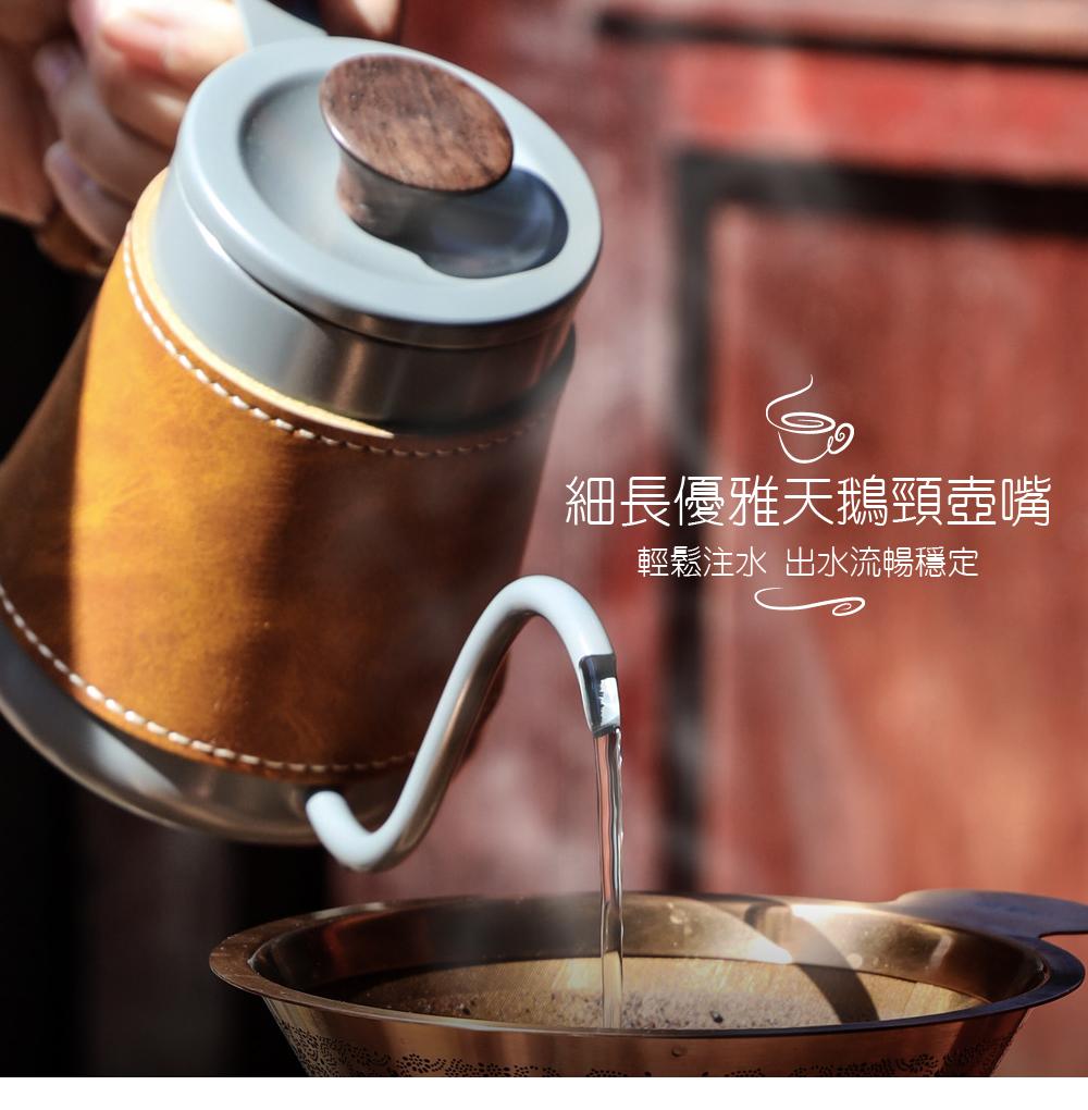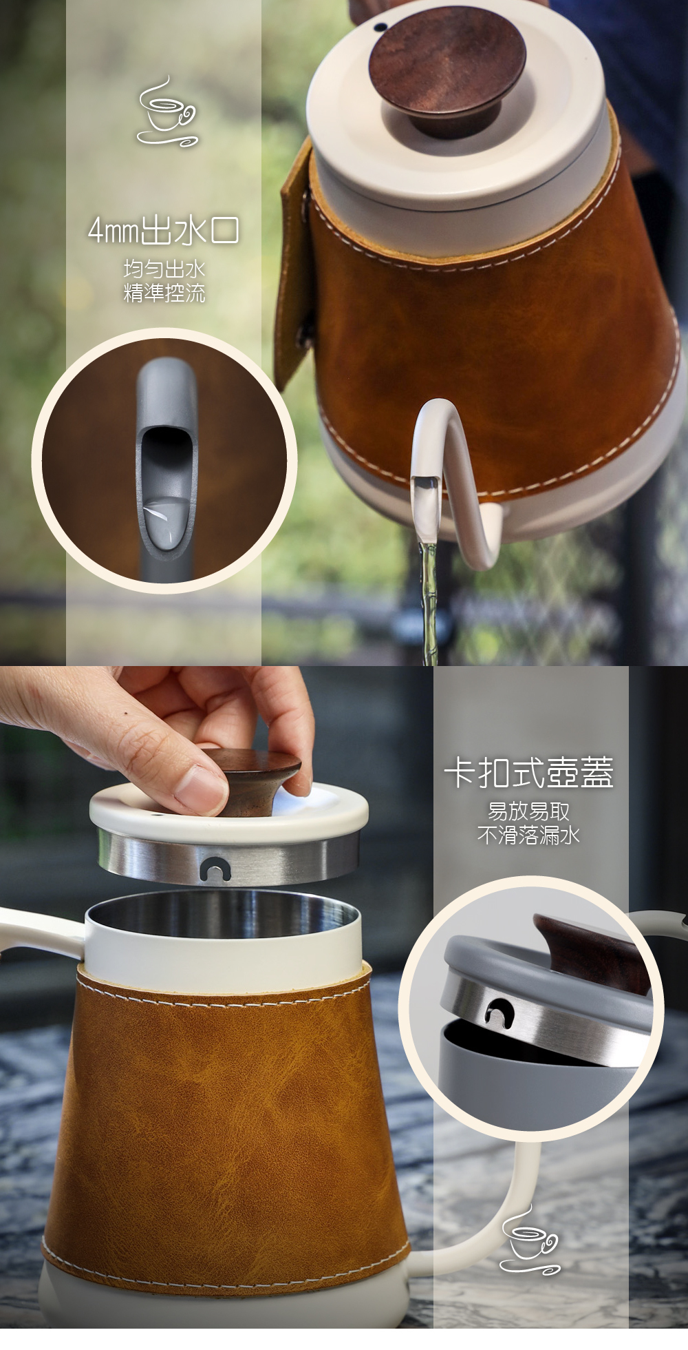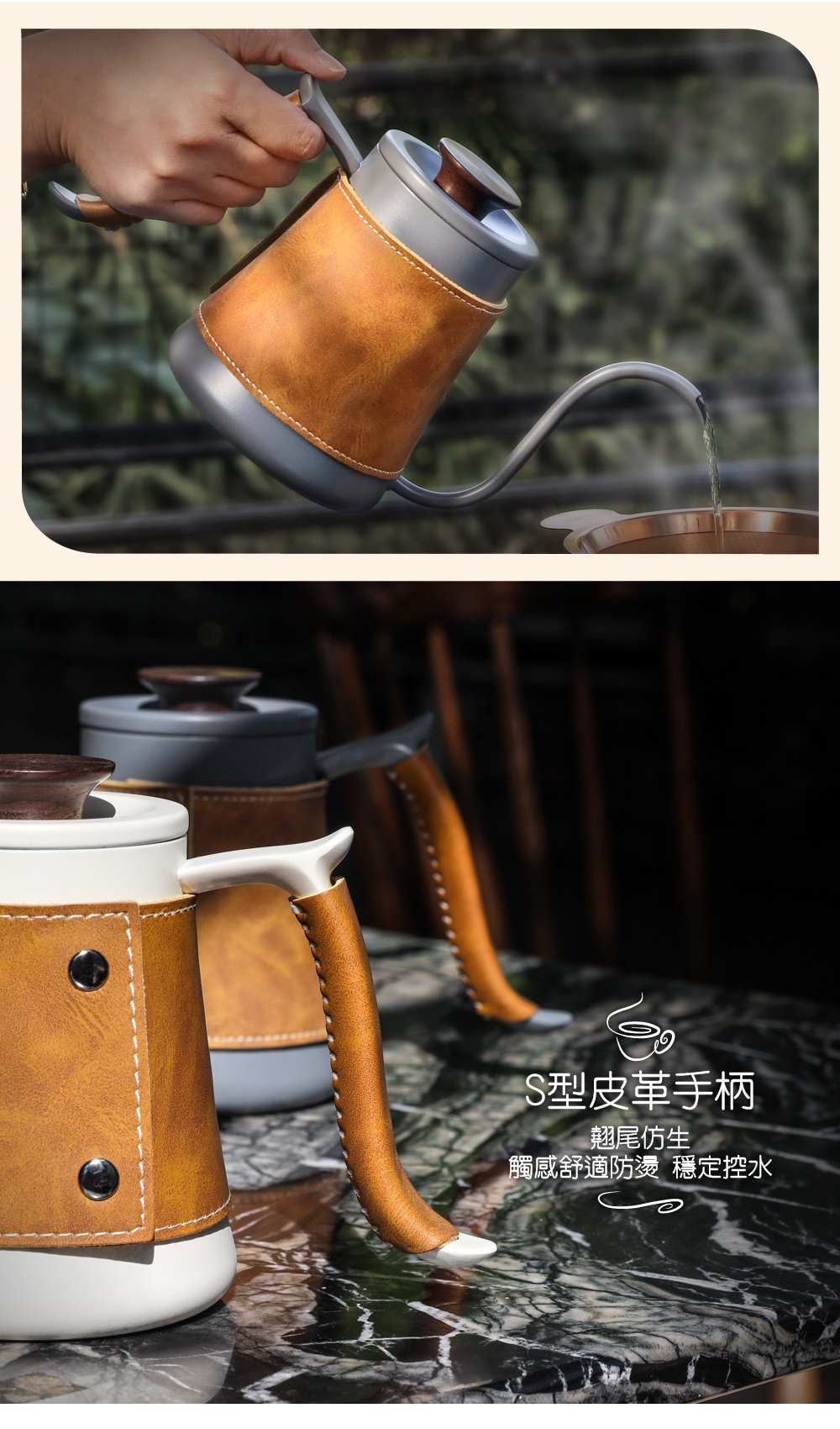.S型皮革手柄,觸感舒適防燙,穩定控水