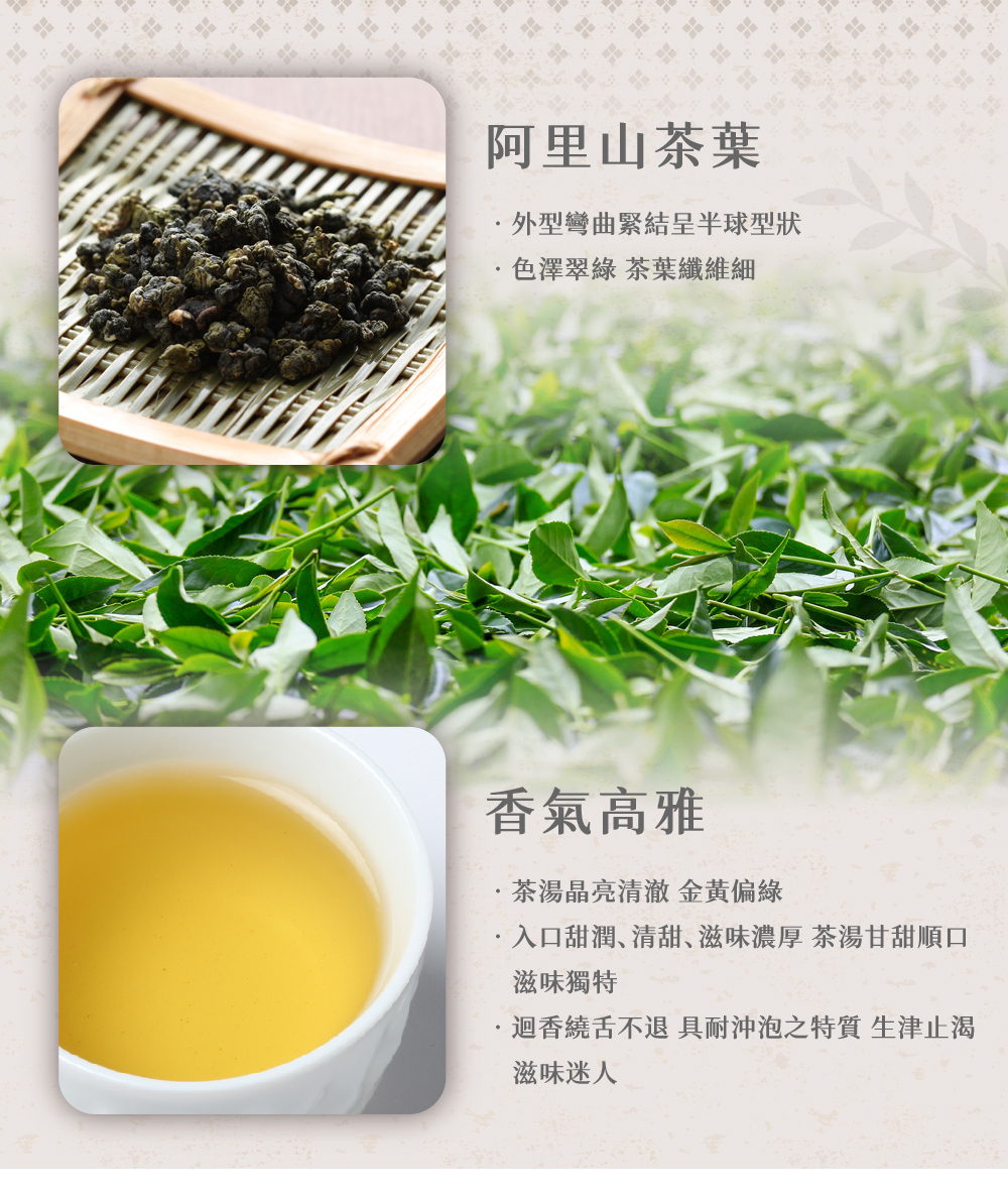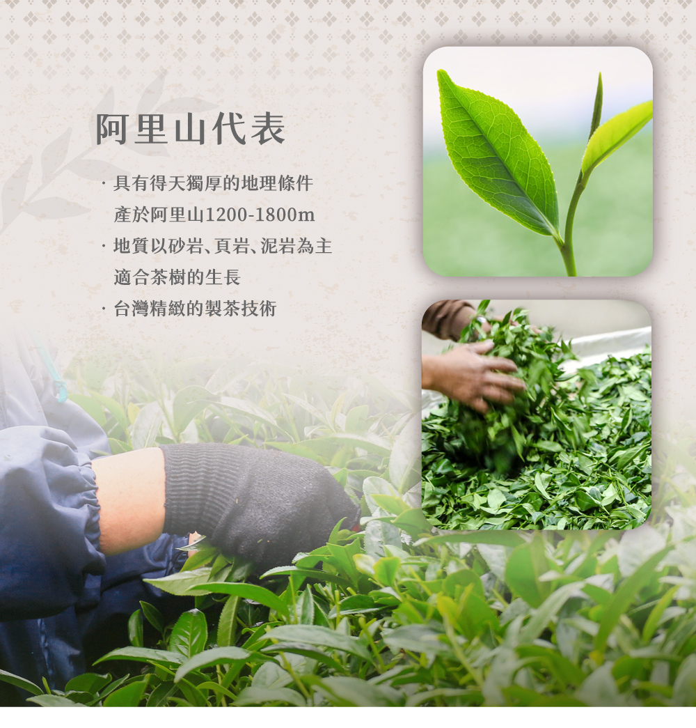 阿里山烏龍茶是台灣最具代表性和知名度的高山茶,海拔在1200-1800公尺之間,因為地勢高、氣候涼爽,終年處於濃霧環繞中,能阻隔陽光直接照射到茶樹,使其具有得天獨厚的地理條件,讓阿里山烏龍茶成為台灣高山茶的絕佳珍品。