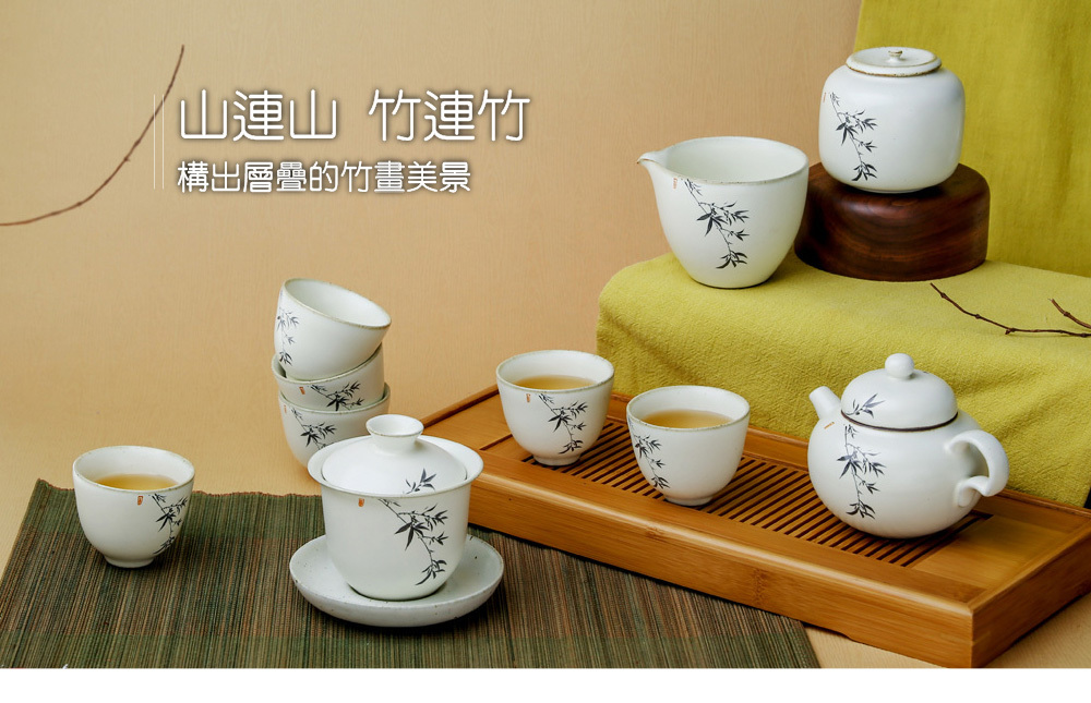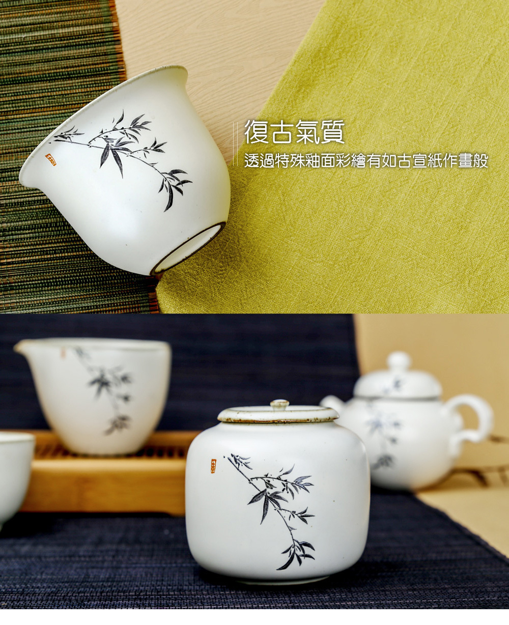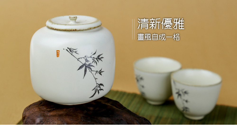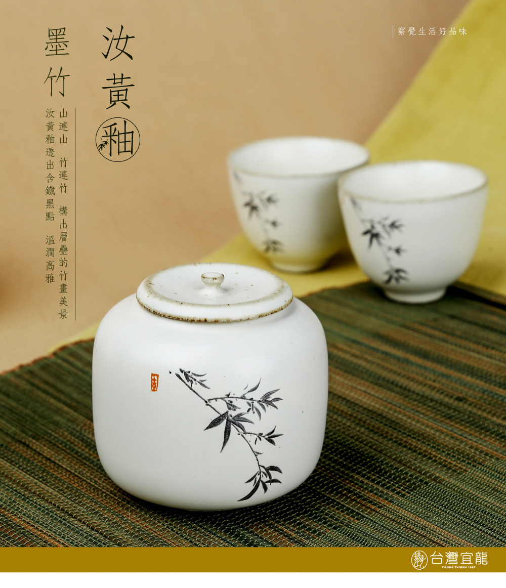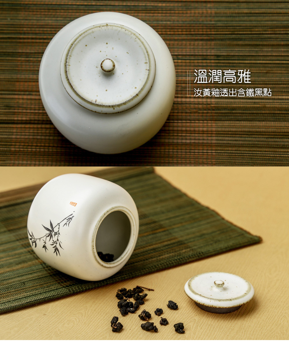 採用含豐富鐵質的陶土為胎料,呈現出古樸質樸的風格。汝窯黃釉透出點點含鐵黑斑,散發出溫潤高雅的氣質。畫風獨具特色,清新脫俗而優雅動人。特殊的釉面彩繪,恍如古宣紙作畫般散發出復古典雅的氣質。層層疊疊的竹畫,營造出山巒連綿、竹影綿延的美景。