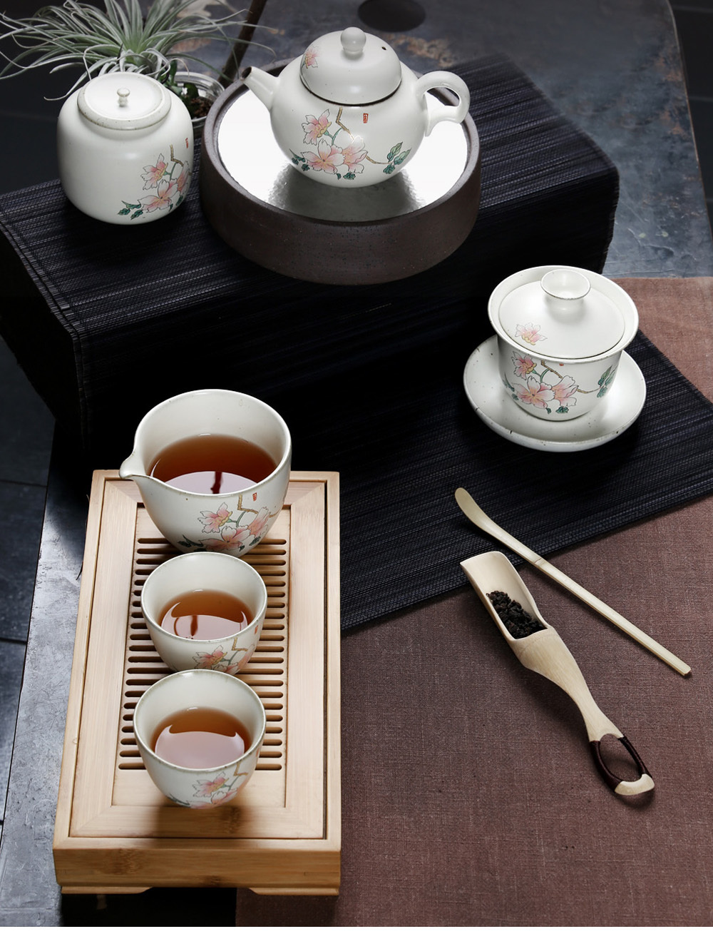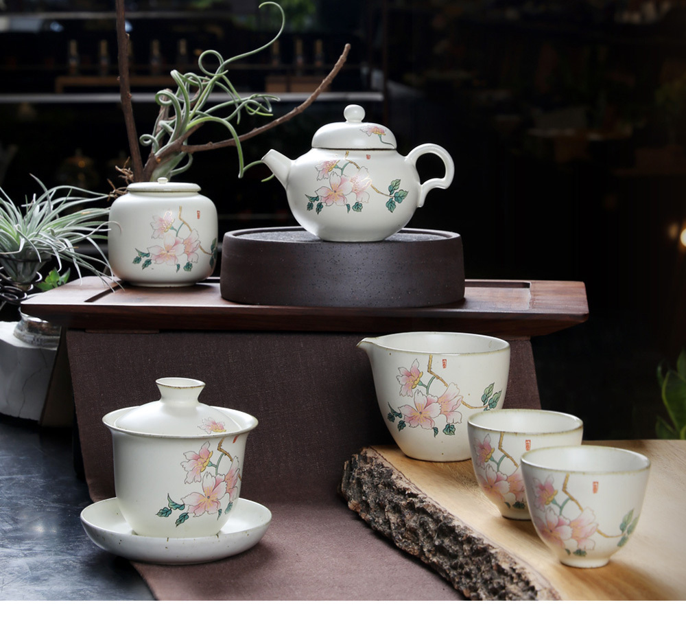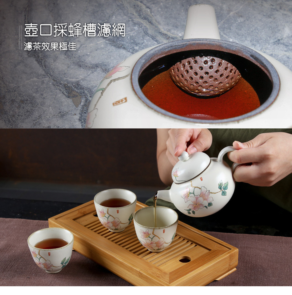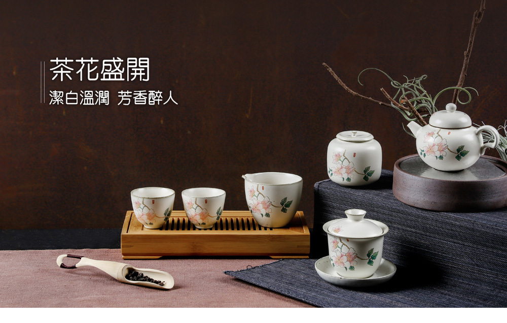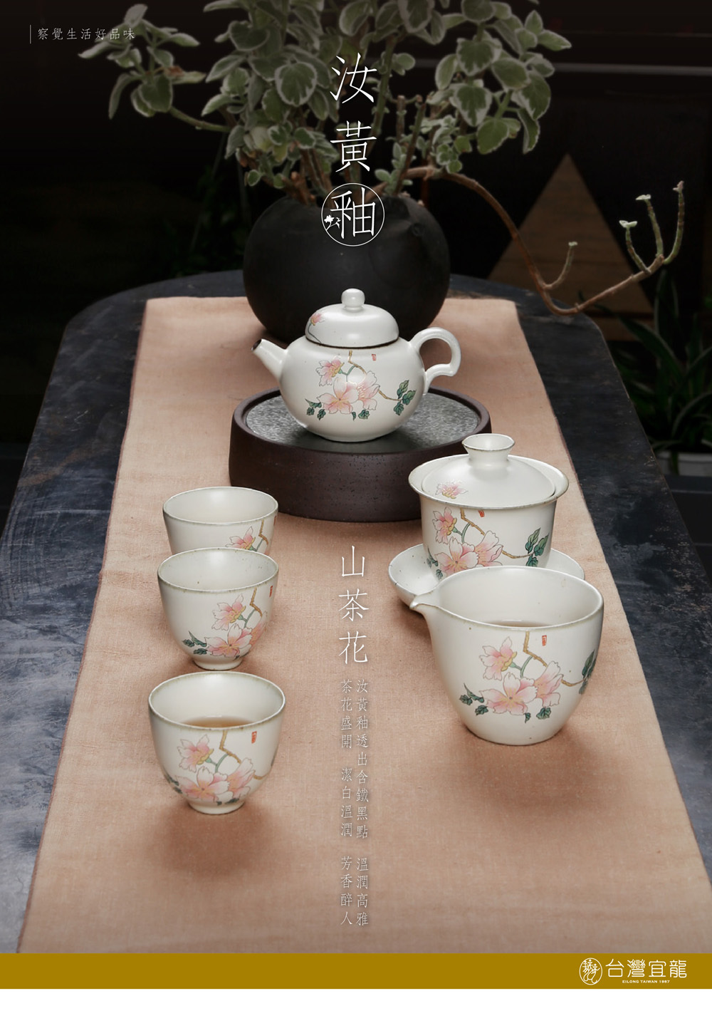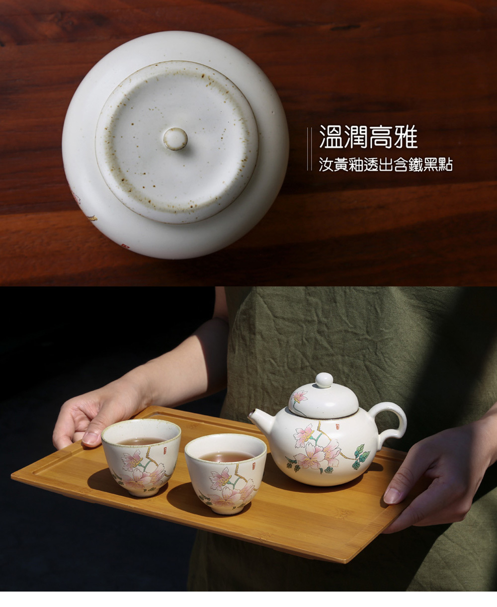 採用含豐富鐵質的陶土為胎料,呈現出古樸質樸的風格。汝窯黃釉透出點點含鐵黑斑,散發出溫潤高雅的氣質。畫風獨具特色,清新脫俗而優雅動人。特殊的釉面彩繪,恍如古宣紙作畫般散發出復古典雅的氣質。茶花盛開,潔白溫潤,芳香撲鼻迷人醉人。層層疊疊的竹畫,營造出山巒連綿、竹影綿延的美景。