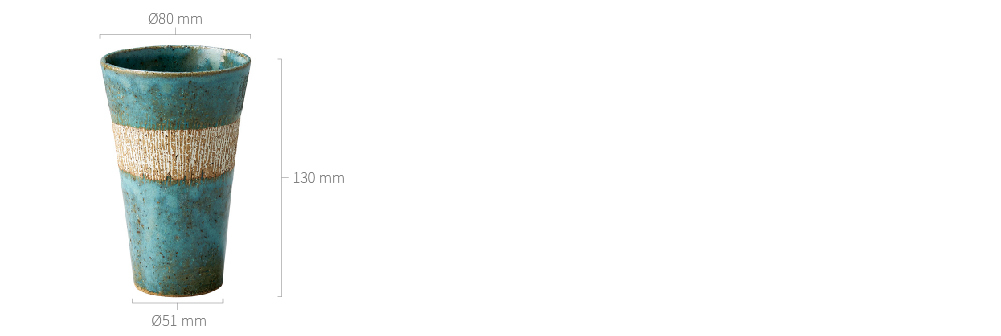採用經典「均窯」釉色,如清晨湖泊般的青綠色澤中,帶有深淺律動的結晶斑點。杯身中段大膽保留了粗礫的土質原色,並施以細密的垂直刻紋,營造出強烈的「半釉半土」對比美學,展現粗獷卻細膩的民藝質感。