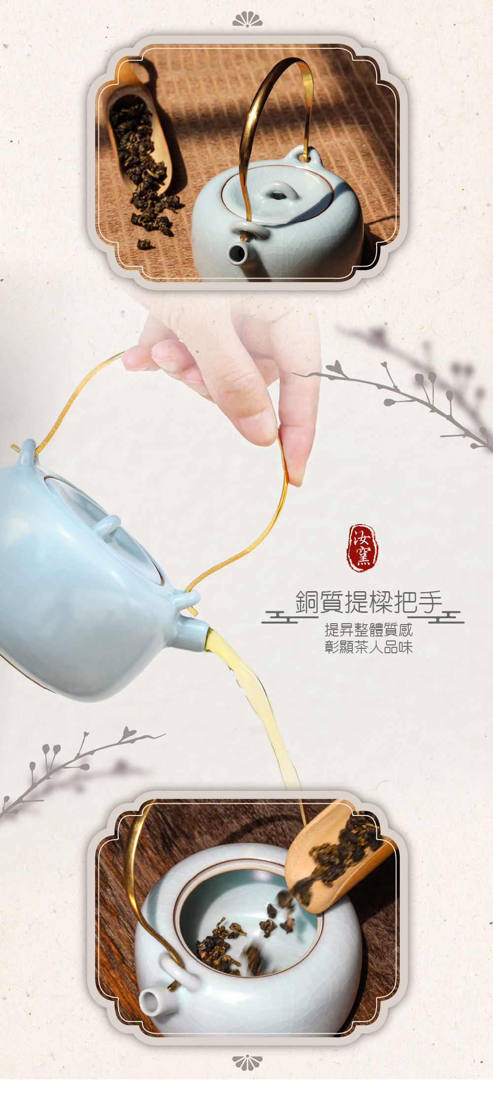 源自南宋汝瓷燒製工藝,不凡之處在其釉色。釉色以天青為主,有「雨過天青雲破處,這般顏色作將來」的美譽。在品茗的歲月,可以享受汝窯開片之美。