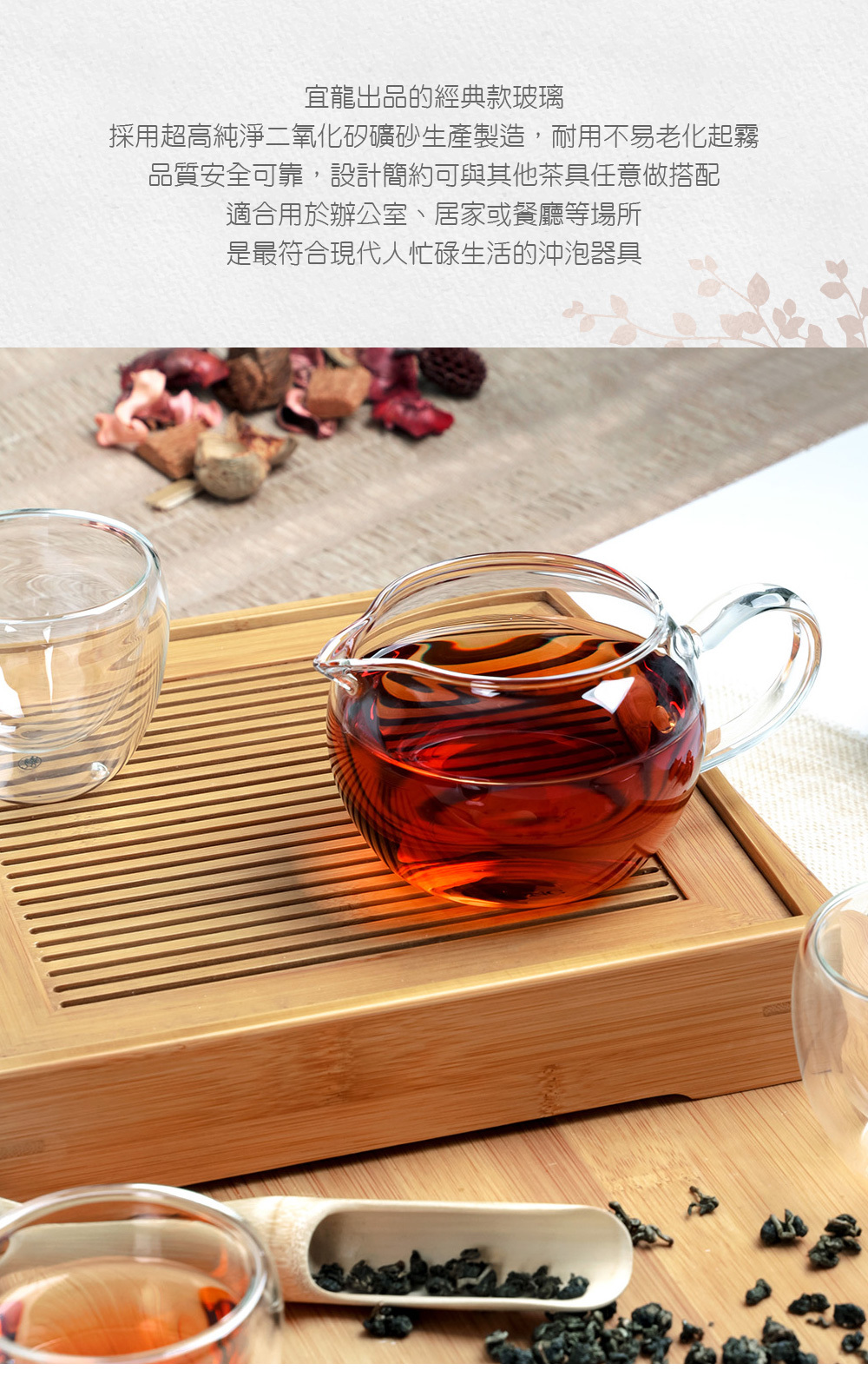 宜龍出品的經典款玻璃,採用超高純淨二氧化矽礦砂生產製造。耐用不易老化起霧,品質安全可靠。設計簡約,可與其他茶具任意做搭配,適用於辦公室、居家、餐廳,符合現代人忙碌生活的沖泡器具。