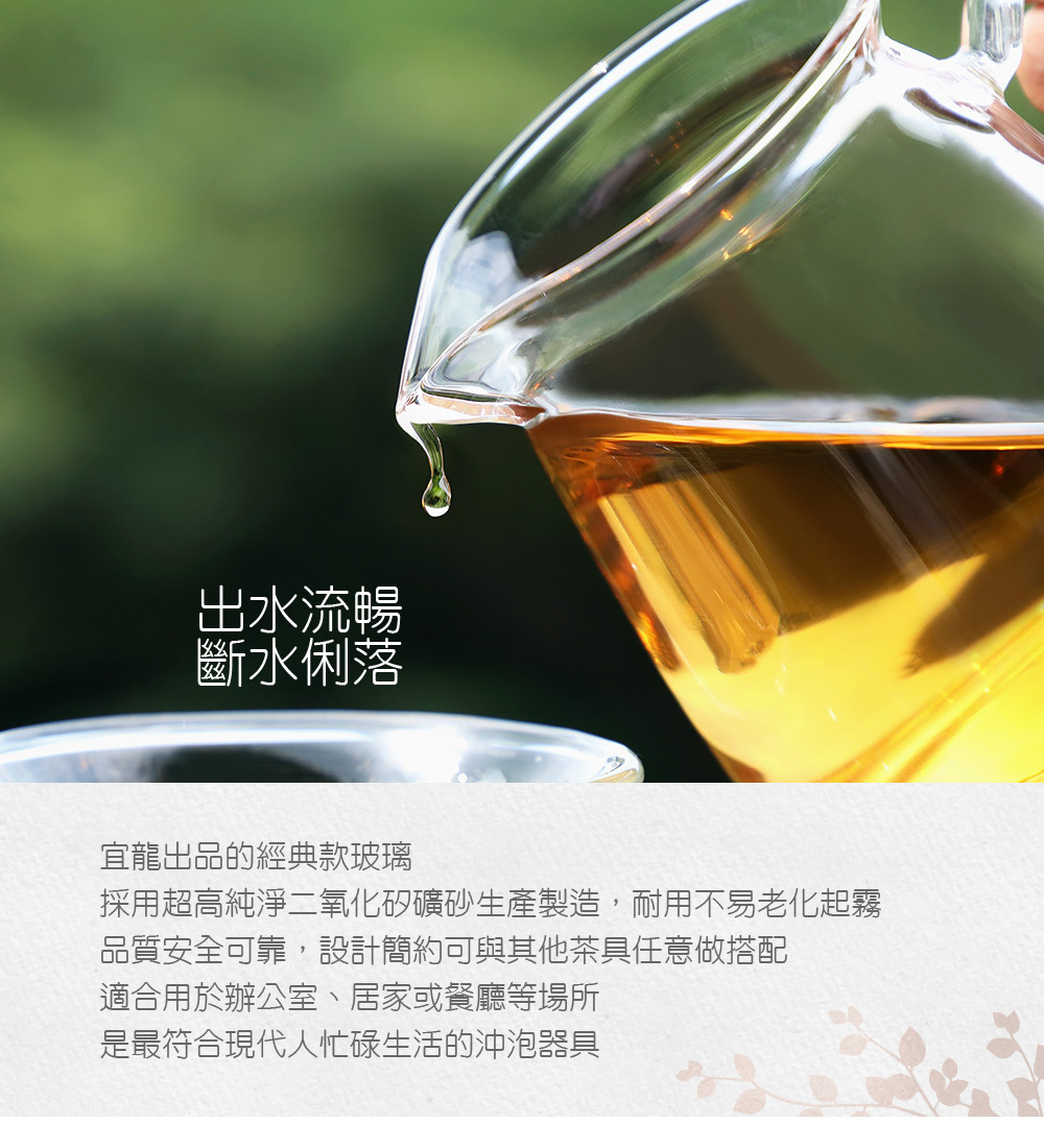 宜龍出品的經典款玻璃,採用超高純淨二氧化矽礦砂生產製造。耐用不易老化起霧,品質安全可靠。設計簡約,可與其他茶具任意做搭配,適用於辦公室、居家、餐廳,符合現代人忙碌生活的沖泡器具。