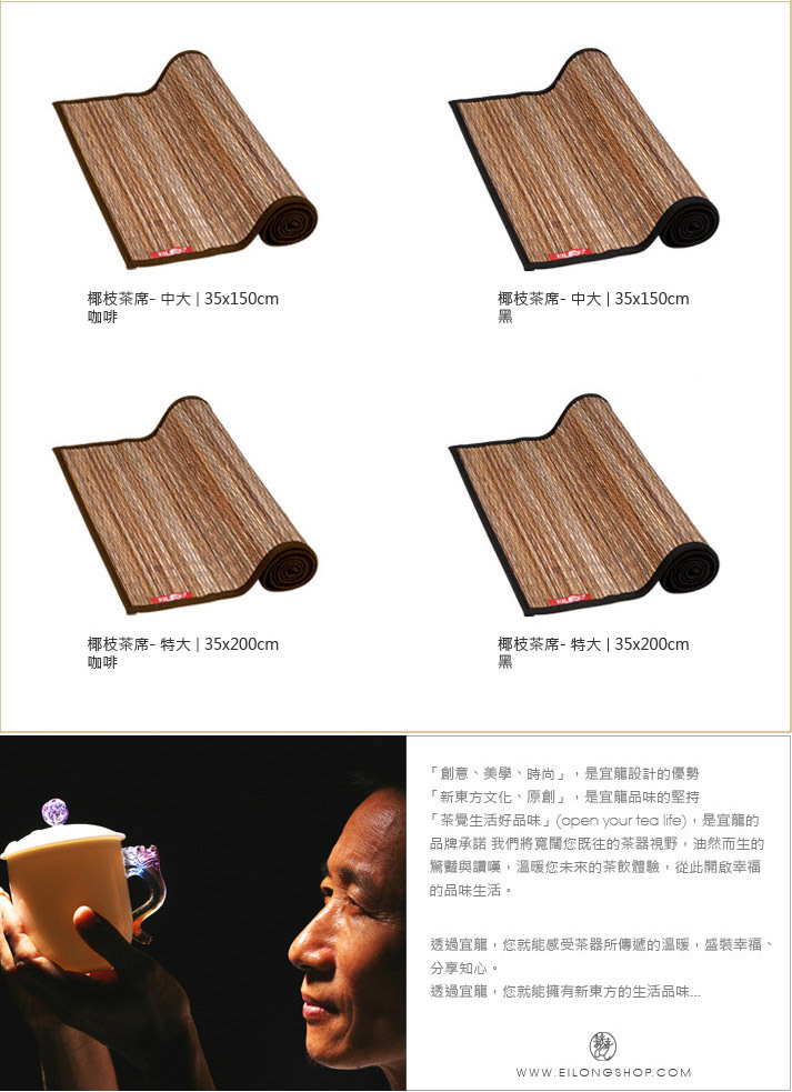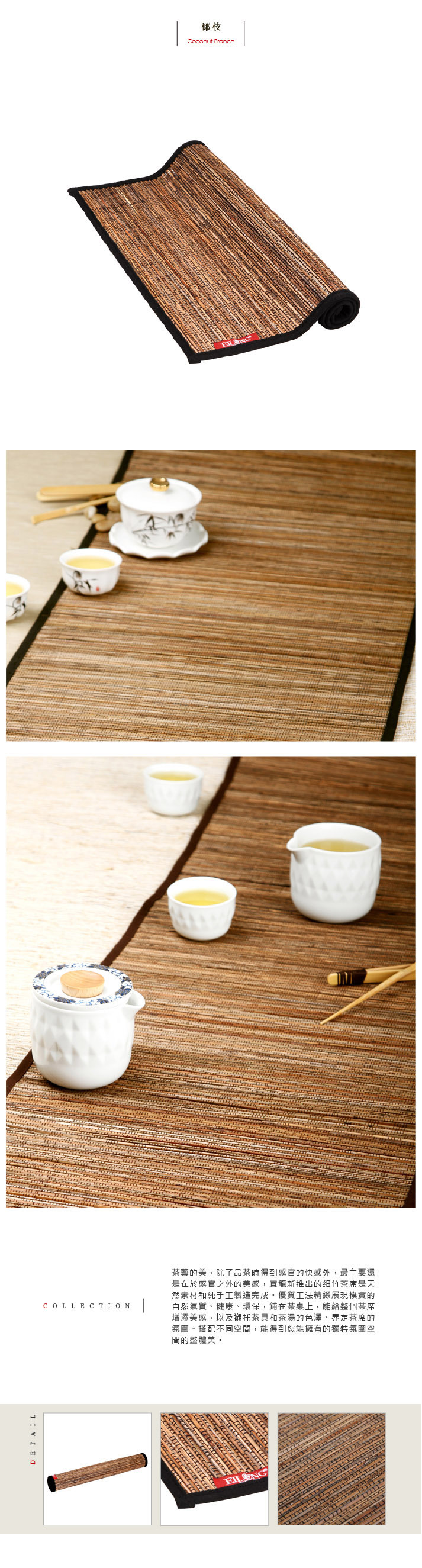 茶藝的美,除了品茶時得到感官的快感外,最主要還是在於感官之外的美感。細竹茶席是天然素材和純手工製造完成。優質工法精緻展現樸實的自然氛圍,鋪在茶桌上,能給整個茶席增添美感,以及襯托茶具和茶湯的色澤,界定茶席的氛圍。