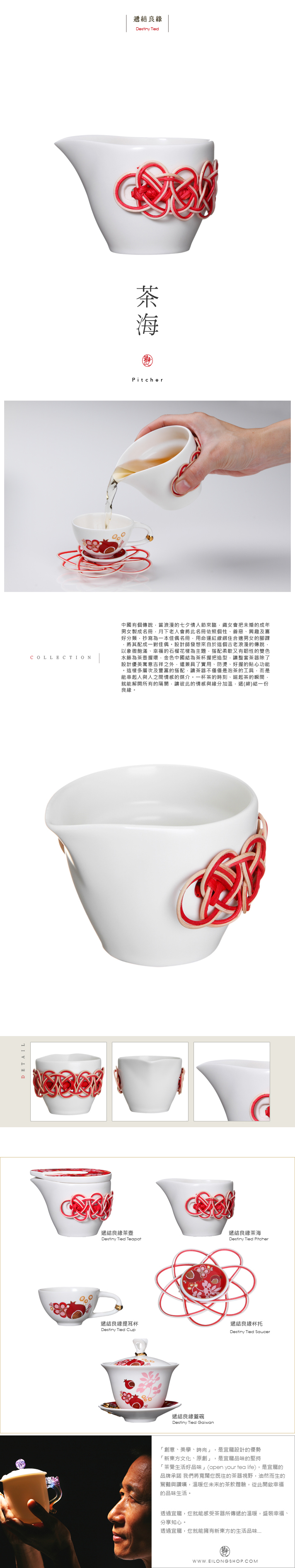 設計師發想來源於這個古老浪漫的傳說,以象徵浪漫、幸福的紅花融合在基座,搭配最代表喜悅的金色水盤與蓮心,金色中融為茶杯和把造型,讓整套茶器在設計上完美融入了多分浪漫元素不再單調,讓這套茶器成為不僅是茶湯承裝及品茗的工具,而是能串起人與人之間情感的媒介。一杯茶的時光,讓茶香的同時就能飄散所有的願景,讓彼此的情感緊緊分加溫,織(緣)給一份良緣