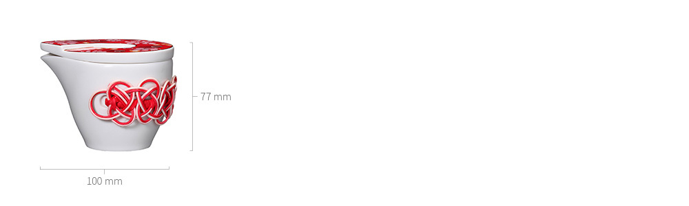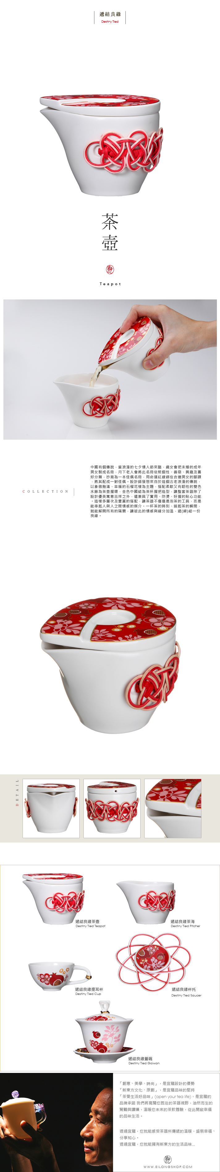 設計師發想來源於這個古老浪漫的傳說,以象徵浪漫、幸福的紅花融合在基座,搭配最代表喜悅的金色水盤與蓮心,金色中融為茶杯和把造型,讓整套茶器在設計上完美融入了多分浪漫元素不再單調,讓這套茶器成為不僅是茶湯承裝及品茗的工具,而是能串起人與人之間情感的媒介。一杯茶的時光,讓茶香的同時就能飄散所有的願景,讓彼此的情感緊緊分加溫,織(緣)給一份良緣