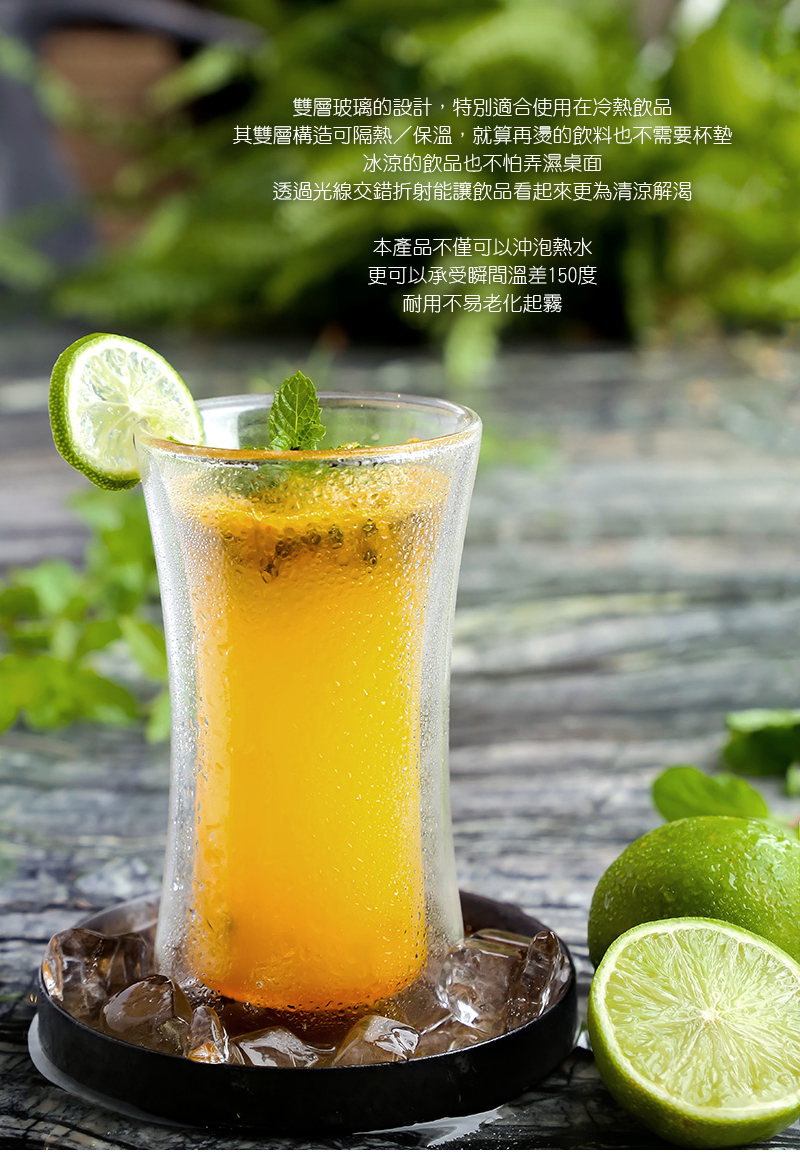 雙層玻璃設計的中空層構造可隔熱保溫,特別適合裝盛冷熱飲品,就算飲料再燙也不需要杯墊。表面不易凝結水氣,冰涼的飲料也不怕弄濕桌面。