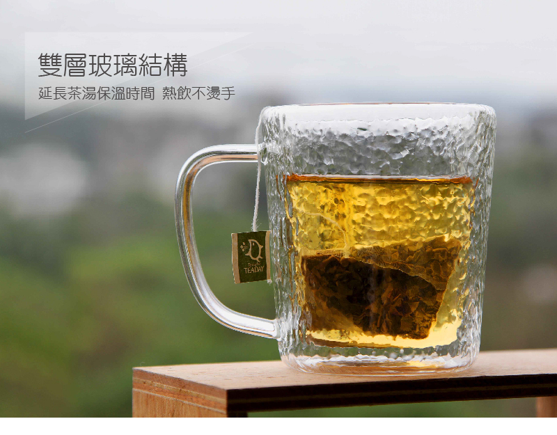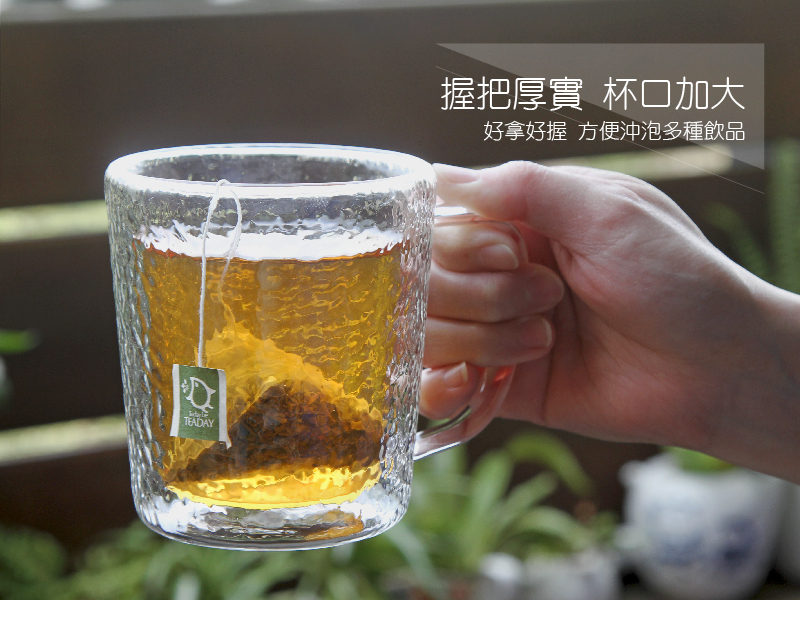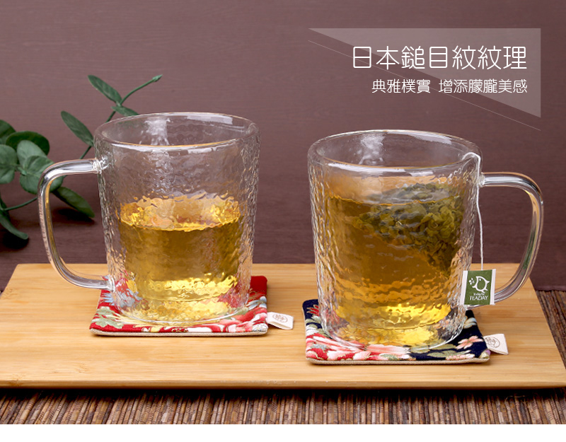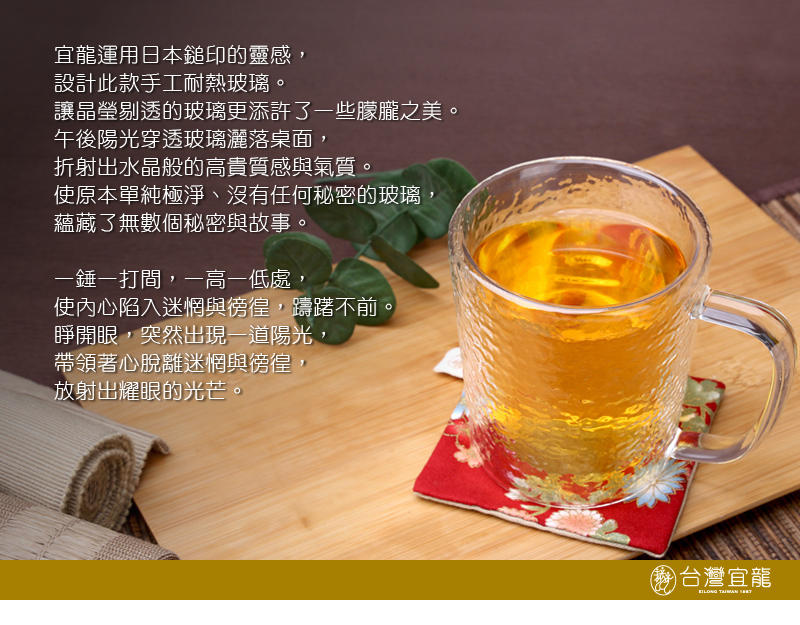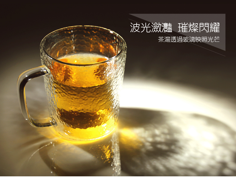 日式鎚目紋結合雙層結構-匠心巧製.新穎設計,波光瀲灩.璀燦閃耀,茶湯透過玻璃映照光芒。