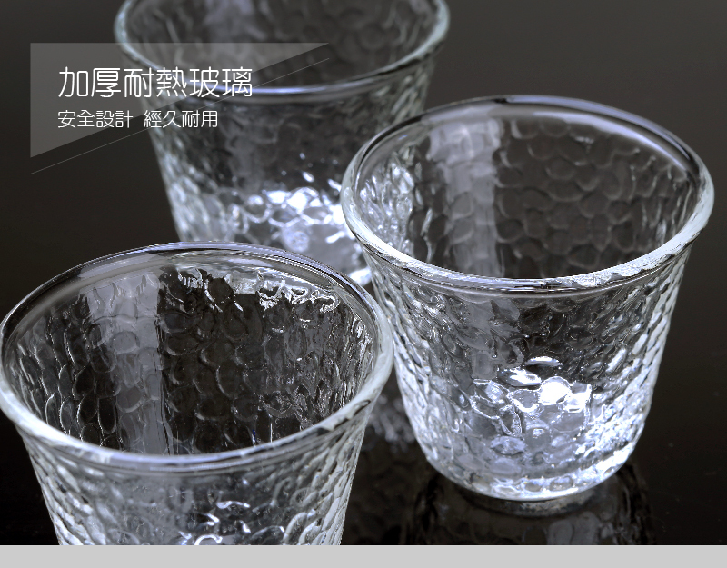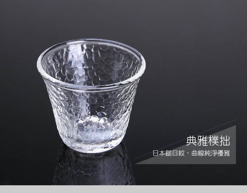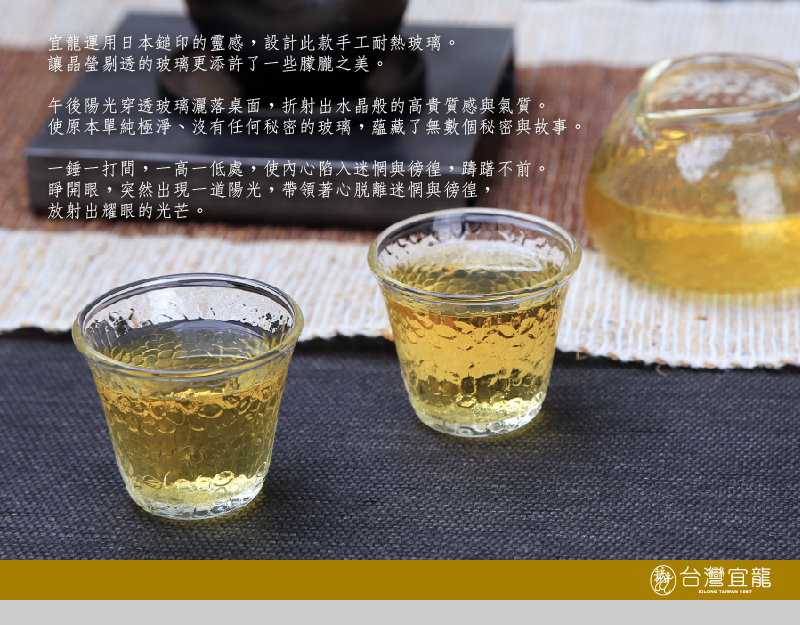 宜龍運用日本鎚印的靈感,設計此款手工耐熱玻璃,讓晶瑩剔透的玻璃更添許了一些朦朧之美。