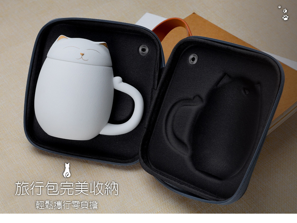 可愛的幸福陶瓷貓杯旅行茶具,兼具趣味與實用性,貓咪圖案溫馨可愛,杯具輕便易攜,完美適合外出旅行或戶外使用,讓每次泡茶都充滿樂趣。