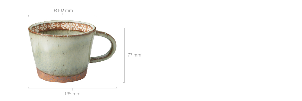 圓潤溫潤的杯身,施以帶有自然結晶感的青瓷釉色,釉面透出如冬日晨霧般的靜謐質感。底部保留陶土原始的深褐色澤與粗礫觸感,展現「半釉半土」的職人美學,大把手與寬口徑設計,讓飲用時光更顯從容自在。