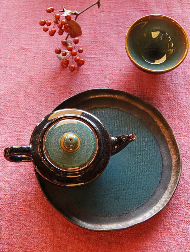 天目曜變壺是由紫砂燒製中式茶壺,其富含鐵離子的特性能使茶湯更加香甜;而由窯變工法做出的流釉花紋,婉如美麗星雲,晶彩炫目。