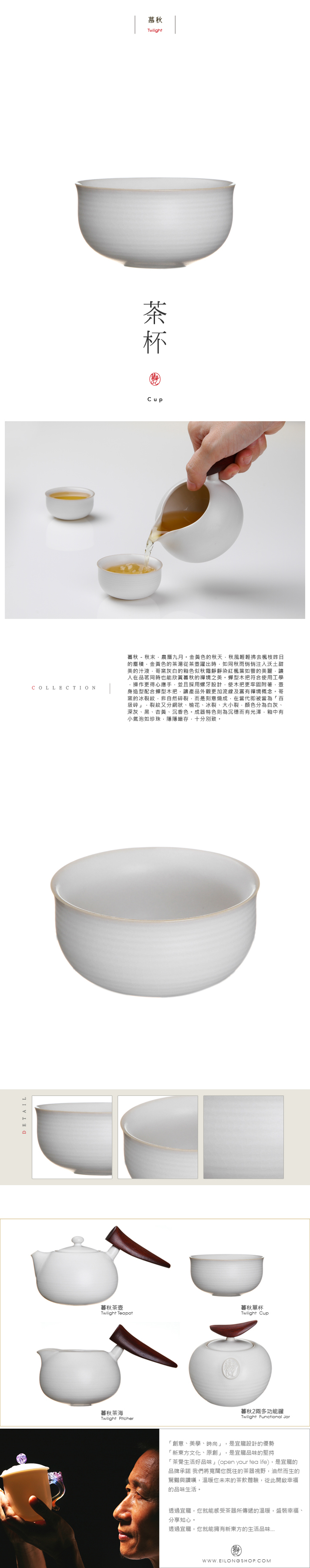 產品外觀流線有境概念,窯的冰裂非自然碎,而是刻意為之,分有網狀、櫻花、冰裂等多種樣式,色系有白灰、深灰、黑、黃等。